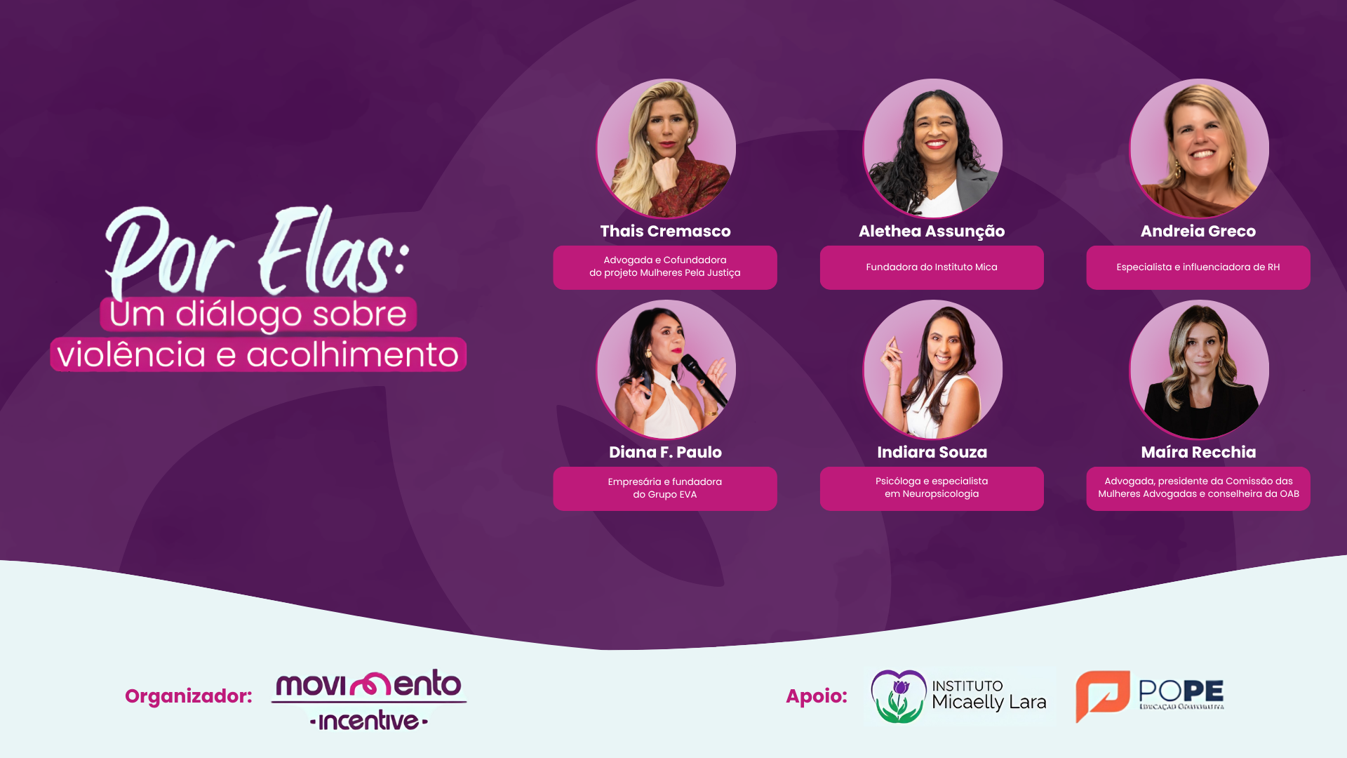 Entre as participantes já apresentadas para o encontro estão Thaís Cremasco, advogada e conselheira da OAB, cofundadora do projeto Mulheres Pela Justiça; Alethea Assunção, Bacharel em Direito e Fundadora do Instituto Mica – organização que atua diretamente no acolhimento de mulheres vítimas de violência doméstica; Diana F. Paulo, trazendo a discussão sobre empreendedorismo feminino e independência financeira; Indiara Souza, psicóloga e especialista em neuropsicologia; Andrea Greco, especialista e influenciadora de RH, e Maíra Recchia, advogada, presidente da Comissão das Mulheres Advogadas e conselheira da OAB.